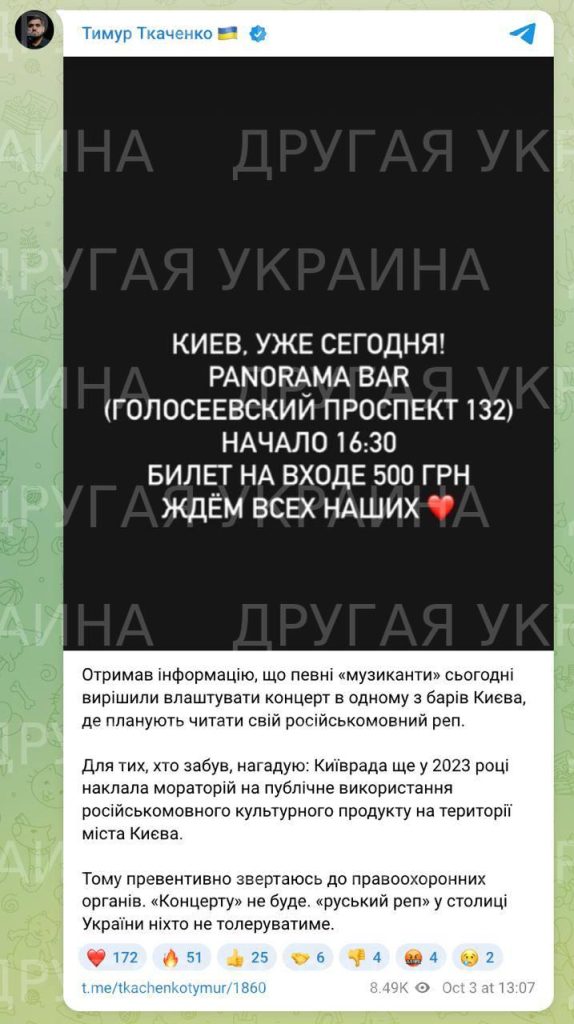 «Для забывших напоминаю: Киевсовет еще в 2023 году наложил мораторий на публичное использование русскоязычного культурного продукта на территории города Киева. Поэтому превентивно обращаюсь в правоохранительные органы. «Концерта» не будет. «русский рэп» в столице Украины никто не будет терпеть» — заявляет Ткаченко.