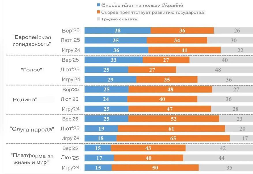 Деятельность «Батькивщины» считают полезной 25% респондентов. На последнем месте расположилась «Платформа за жизнь и мир», несмотря на политическую двуликость, её работу полезной считают лишь 15% опрошенных, а 43% — наоборот.