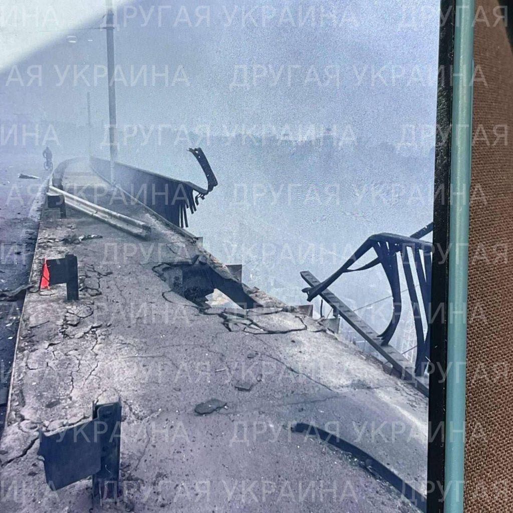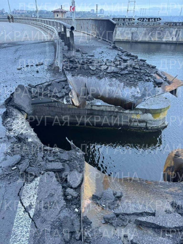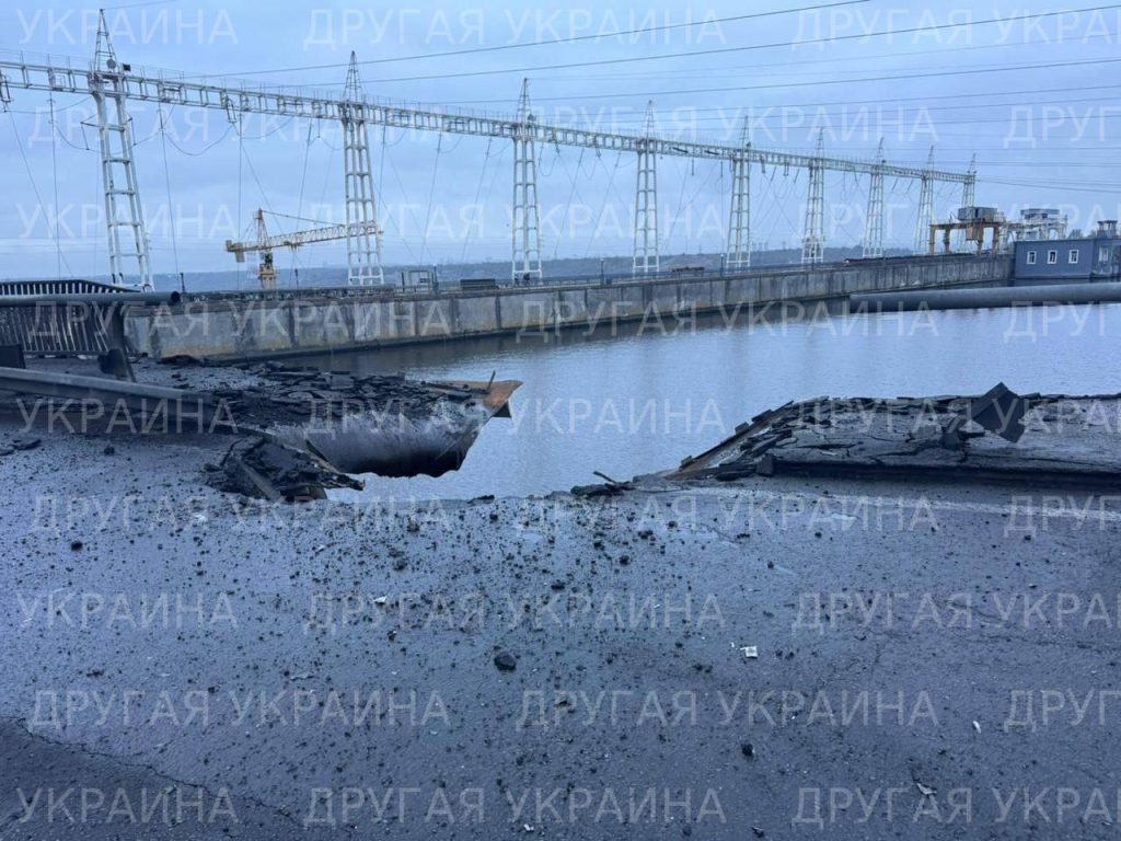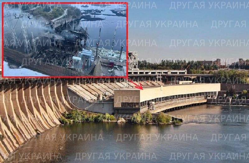 В сети опубликованы кадры с территории Днепровской гидроэлектростанции, по которой накануне был нанесён удар. По имеющимся данным, в результате атаки полностью уничтожено машинное отделение станции, а также серьёзно повреждено открытое распределительное устройство на 154 кВ.