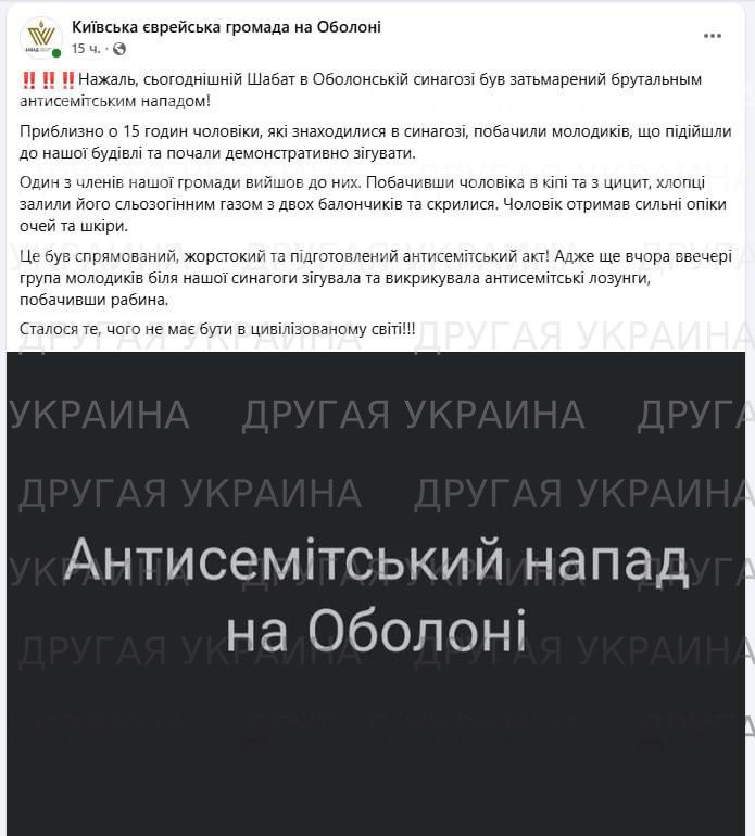 В субботу днем несколько недоумков начали демонстративно зиговать возле синагоги. Когда один из членов общины вышел к ним, нападавшие, увидев мужчину в кипе, облили его слезоточивым газом из двух баллончиков и скрылись. Пострадавший получил сильные ожоги глаз и кожи.