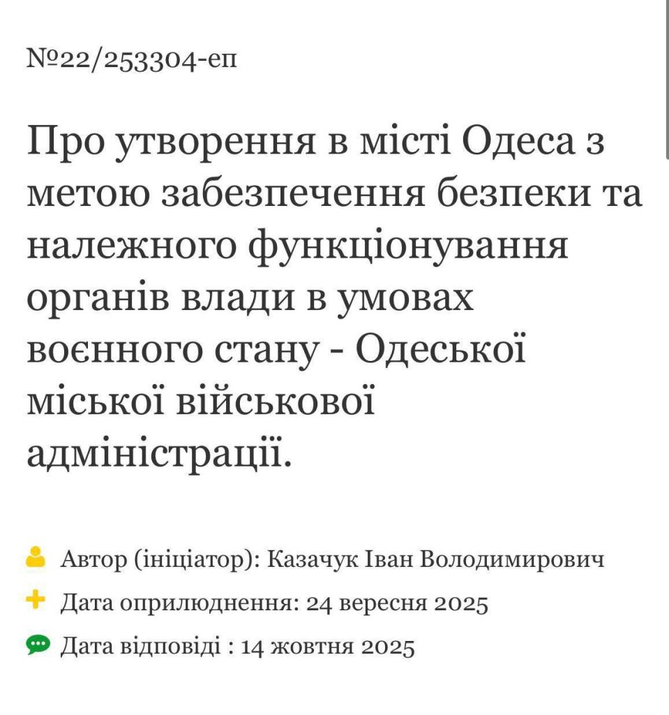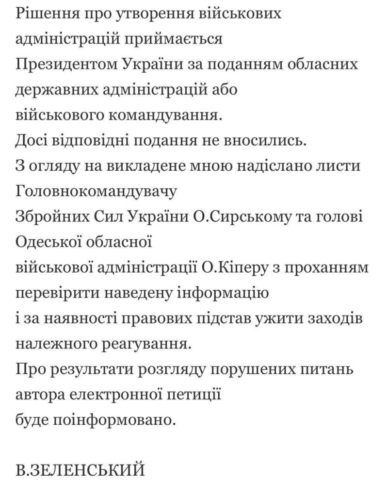 «До сих пор соответствующие представления не вносились. Учитывая изложенное, мною отправлены письма главнокомандующему Сырскому и председателю Одесской областной военной администрации Киперу с просьбой проверить приведенную информацию и при наличии правовых оснований принять меры надлежащего реагирования» — сообщил глава киевского режима.