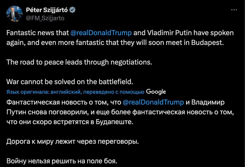 Министр иностранных дел Венгрии Петер Сийярто положительно отреагировал на предстоящую встречу Владимира Путина и Дональда Трампа в Будапеште.