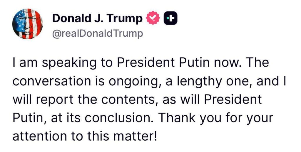«Я сейчас разговариваю с президентом Путиным. Разговор продолжается, он длительный, и я, как и президент Путин, доложу о его содержании по его завершении. Благодарю вас за внимание к этому вопросу!» — говорится в сообщении Трампа.