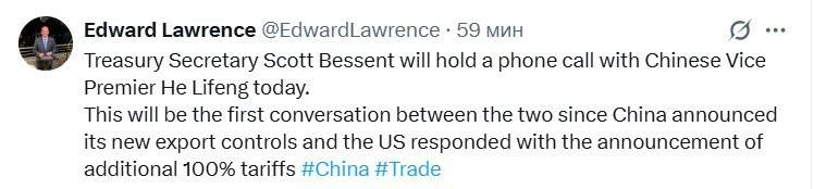 Министр финансов США Скотт Бессент проведет сегодня телефонный разговор с вице-премьером Китая Хэ Лифэном. Об этом заявил журналист Fox News Эдвард Лоуренс в социальной сети Х*.