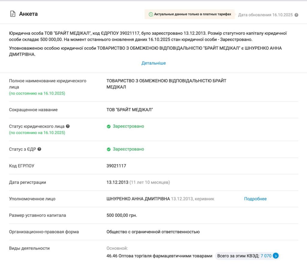 С 2013 года Анна Шнуренко является 100% владелицей компании «Брайт Медикал», в уставной капитал которой вложено 500 тыс грн (12 тыс долл). Она зарегистрирована в Киеве и связана с медицинской или фармацевтической деятельностью.