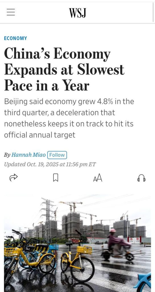 По данным издания, во втором квартале 2025 года ВВП Китая увеличился на 5,2% по сравнению с аналогичным периодом прошлого года, однако в третьем квартале показатель снизился до 4,8%.