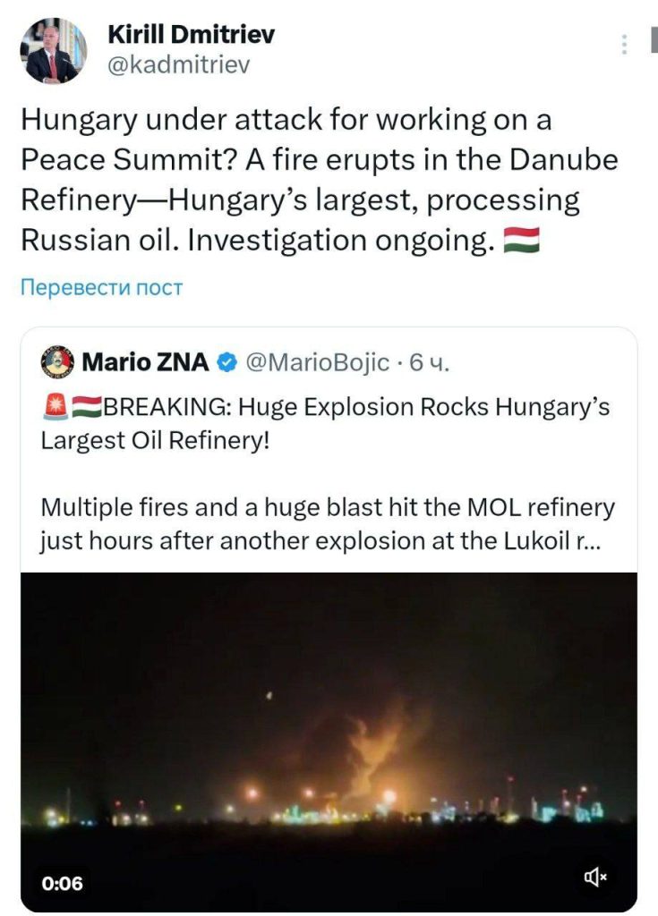 Глава Российского фонда прямых инвестиций (РФПИ) Кирилл Дмитриев задался вопросом, не является ли пожар на крупнейшем венгерском НПЗ ответом на готовящийся мирный саммит.