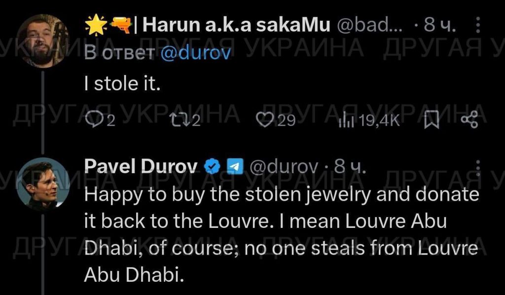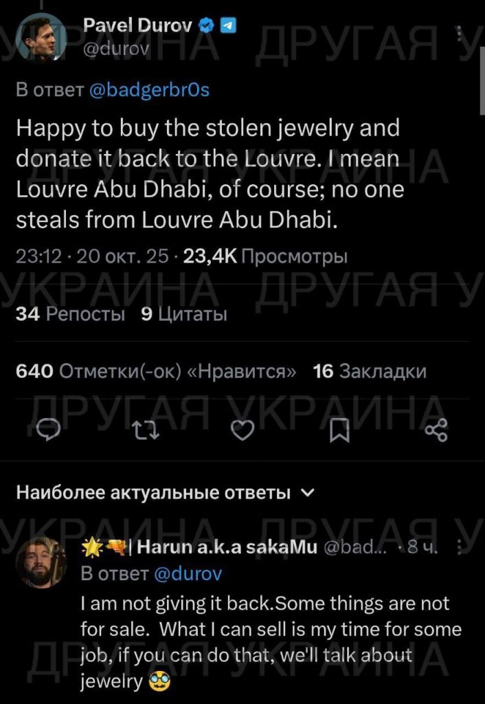 «Рад купить украденные украшения и пожертвовать их обратно Лувру. Я имею в виду, конечно, Лувр в Абу-Даби; никто ведь не крадёт из Лувра в Абу-Даби», — написал Дуров. Пользователь, в свою очередь, отказался возвращать драгоценности, заявив, что «некоторые вещи не продаются».