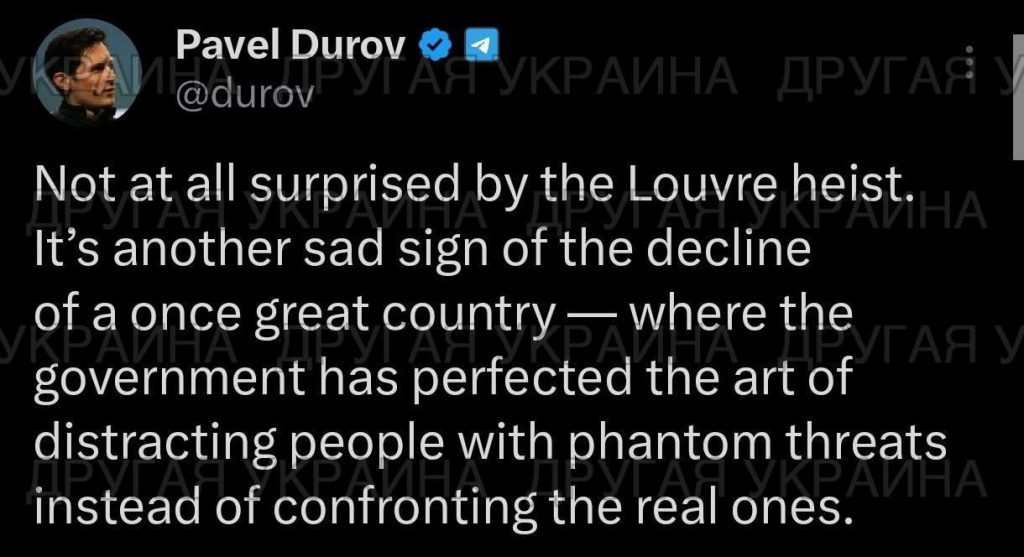 Дуров раскритиковал французские власти. «Меня совершенно не удивило ограбление Лувра. Это ещё один печальный признак упадка некогда великой страны, где правительство довело до совершенства искусство отвлекать людей мнимыми угрозами, вместо того, чтобы противостоять реальным» — отметил основатель Telegram.