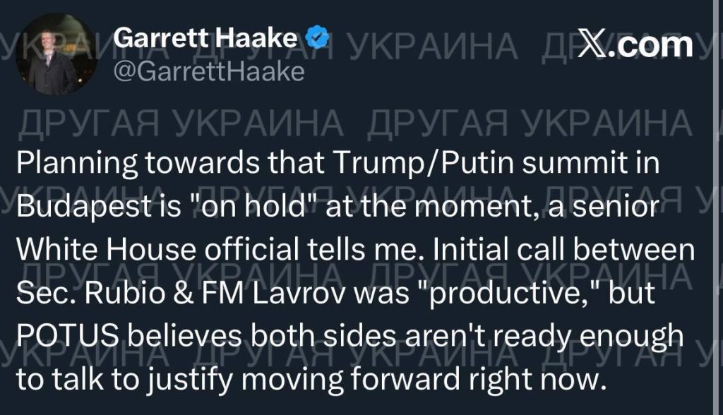 Планирование встречи между Дональдом Трампом и Владимиром Путиным в Будапеште в настоящее время «приостановлено». Об этом сообщил высокопоставленный представитель Белого дома, передает журналист NBC News Гаррет Хааке.
