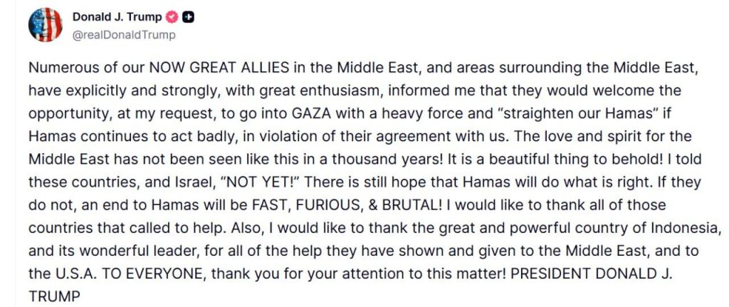 По словам лидера США, союзные государства уже выразили готовность направить свои вооружённые силы в сектор Газа, если ситуация вновь выйдет из-под контроля.