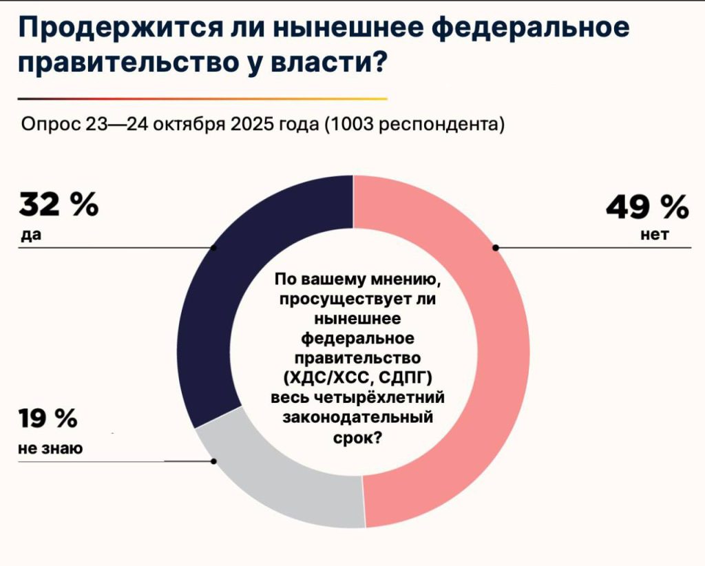 Согласно данным опроса, проведенного институтом INSA, почти половина (49%) граждан Германии считают, что нынешняя правящая коалиция в стране скоро распадется. Только 32% респондентов выразили уверенность в том, что коалиция продержится до конца своего срока в 2029 году.