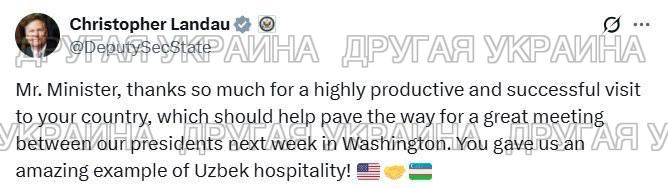 Ландау поблагодарил министра иностранных дел Узбекистана Бахтиера Саидова за «продуктивный и успешный визит». Он также выразил уверенность, что состоявшиеся переговоры послужат основой для «прекрасной встречи» между Трампом и Мирзиеевым.