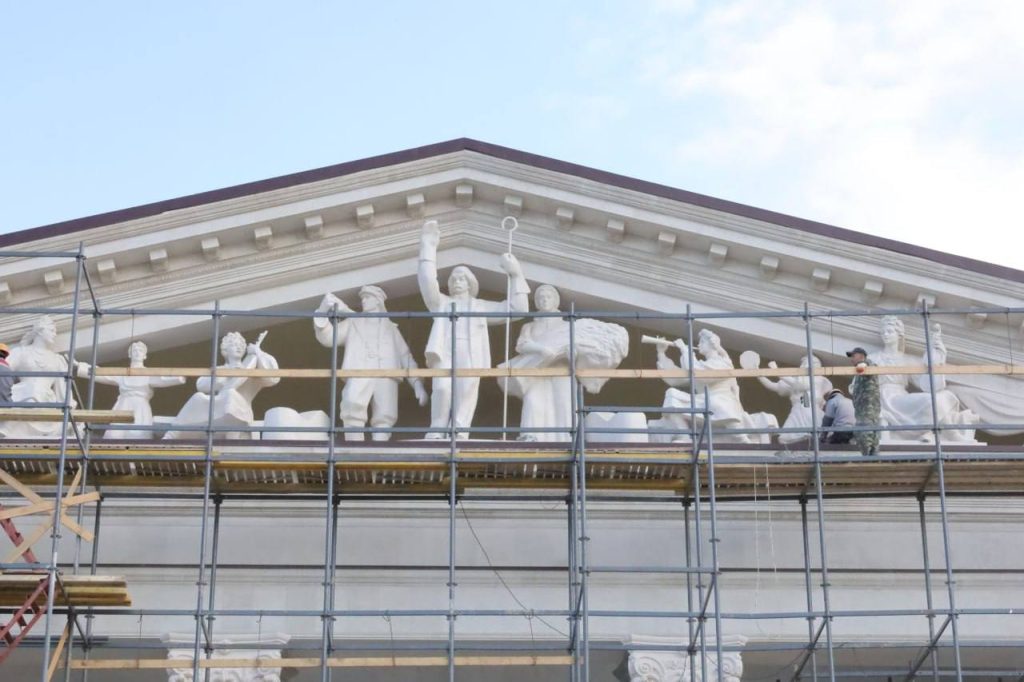 «На текущий момент завершаются монтаж металлоконструкций крыши и облицовка стен декоративным камнем. Установлены девять скульптурных фигур на фронтоне здания, ведется благоустройство прилегающей территории. Параллельно продолжаются работы во внутренних помещениях и монтаж театрального оборудования, включая поворотный круг сцены» — сообщил Пушилин.