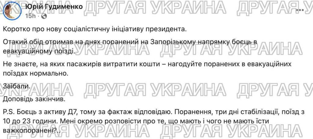 Очередной скандал с питанием в ВСУ разразился в неожиданном месте — советник главы антикоррупционного совета при ВСУ Алексей Гудименко устроил разбор полётов, показав в своём Telegram-канале «праздничный» обед для раненого бойца.
