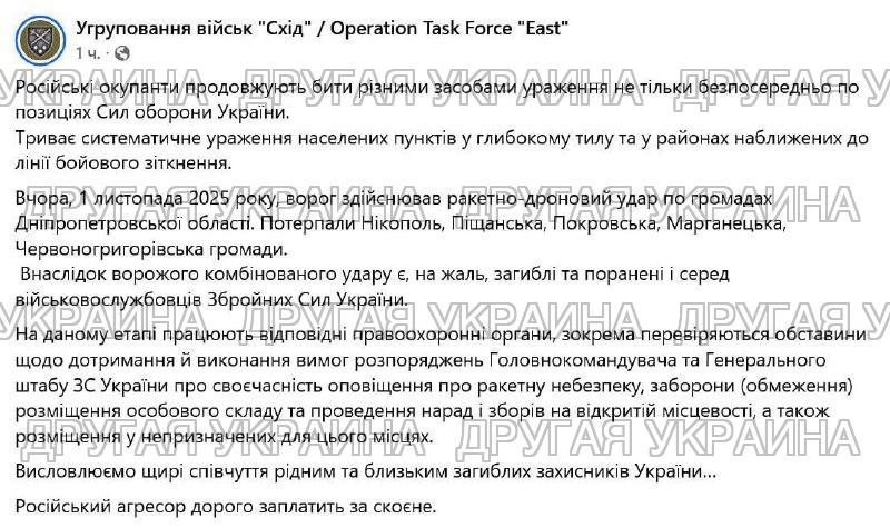 Украинская группировка «Восток» опубликовала заявление, в котором говорится, что в результате атаки есть погибшие и раненые среди личного состава ВСУ. Отмечается, что часть боевиков могла оказаться под огнем из-за ошибок командования, в частности, из-за построения на открытой местности.