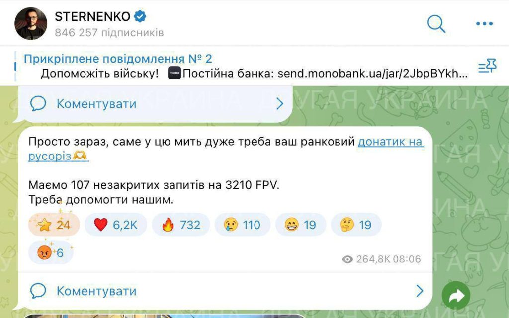 Примечательно, что в тот же день Сергей, по традиции, начал утро с призыва к подписчикам поддержать сбор и скинуться на дрон.