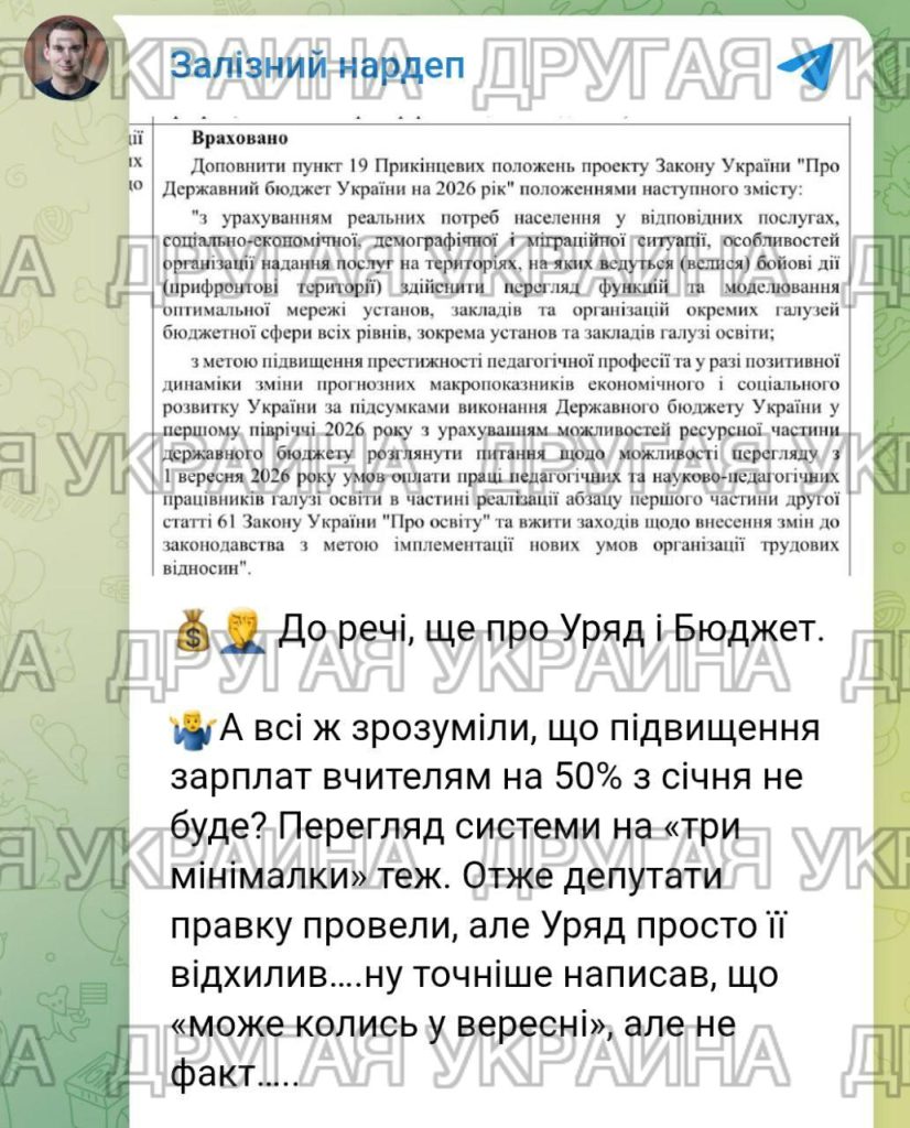 Нардеп Железняк сообщил, что обещанное властями повышение зарплат учителям на 50% с января не состоится. Также не будет выполнено требование закона об образовании, согласно которому начинающий учитель должен получать три минимальные зарплаты (24 тысячи гривен).