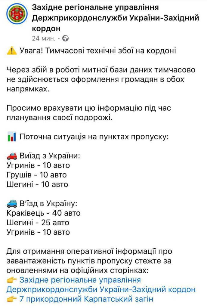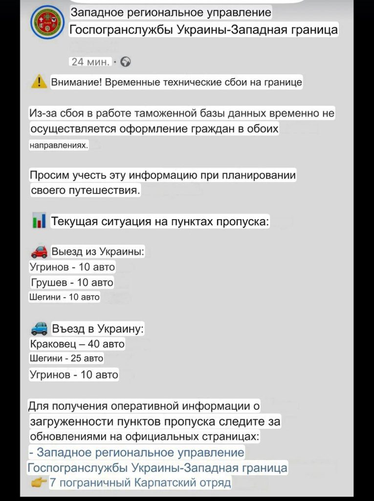 Государственная пограничная служба Украины сообщила о полной остановке пропуска граждан и транспортных средств через границу в обоих направлениях.