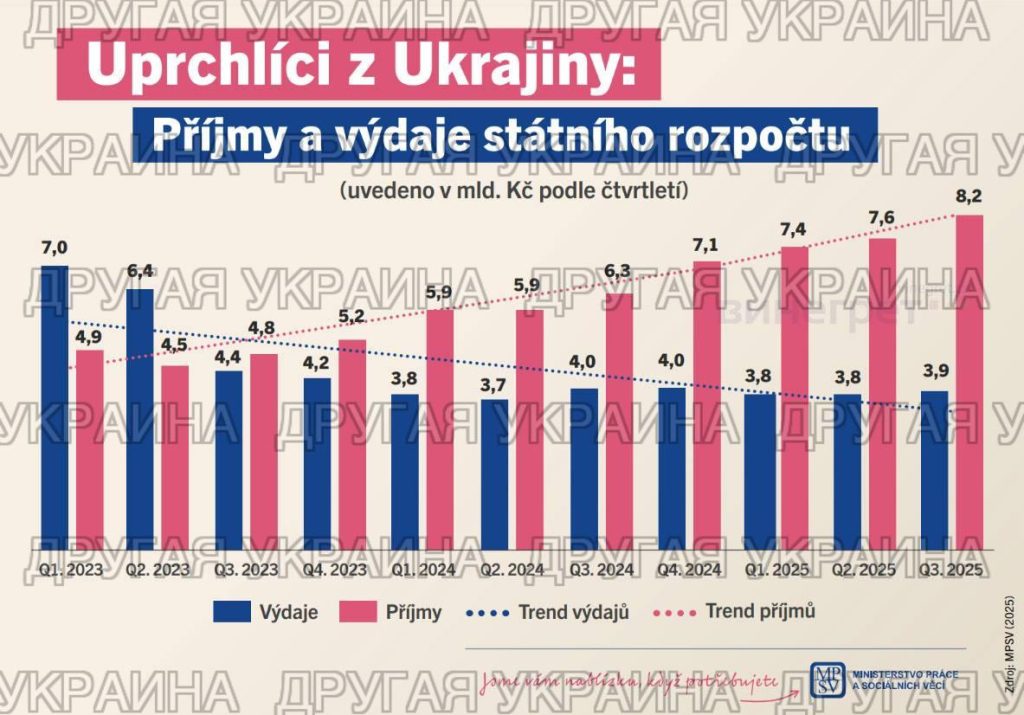 Согласно отчету, по итогам третьего квартала 2025 года украинские переселенцы внесли в чешский бюджет 8,2 млрд крон ($394 млн) налогов и отчислений, получив при этом всего 3,9 млрд крон ($187 млн) на поддержку. Таким образом, чистая прибыль бюджета составила 4,3 млрд крон ($206 млн).
