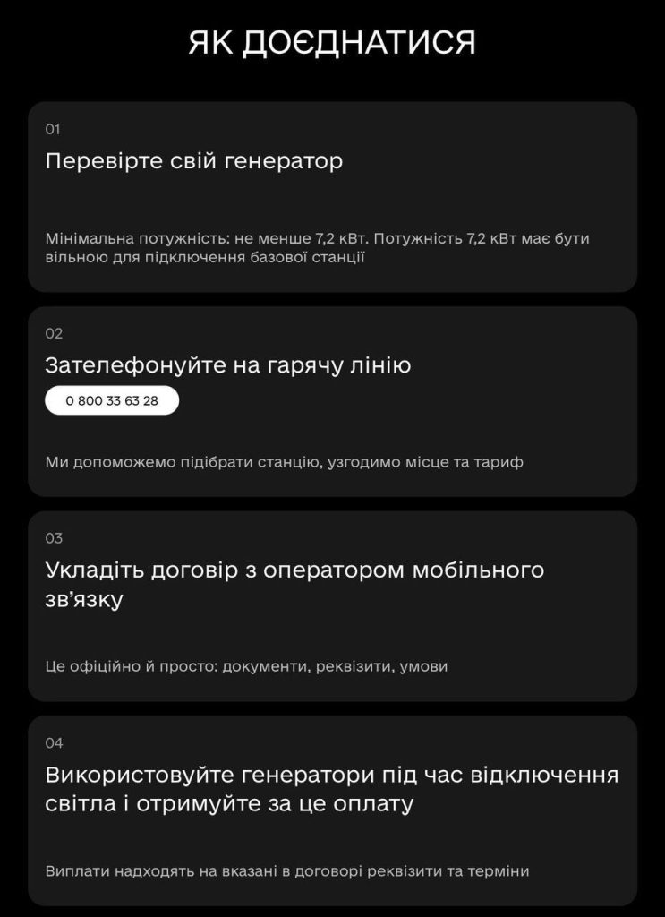 Теперь владельцы генераторов мощностью от 7,2 кВт смогут подключать их к базовым станциям мобильных операторов и получать за это от 110 (212 руб) до 140 гривен (270 руб) в час.