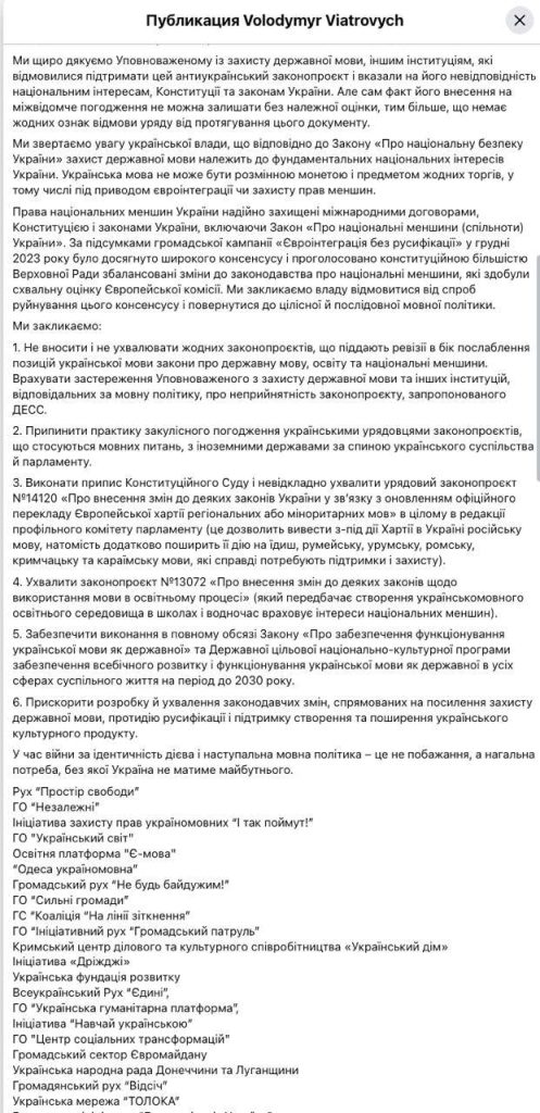 По информации нардепа Вятровича со ссылкой на общественные организации, Госэтнополитики разослало законопроект на согласование.
