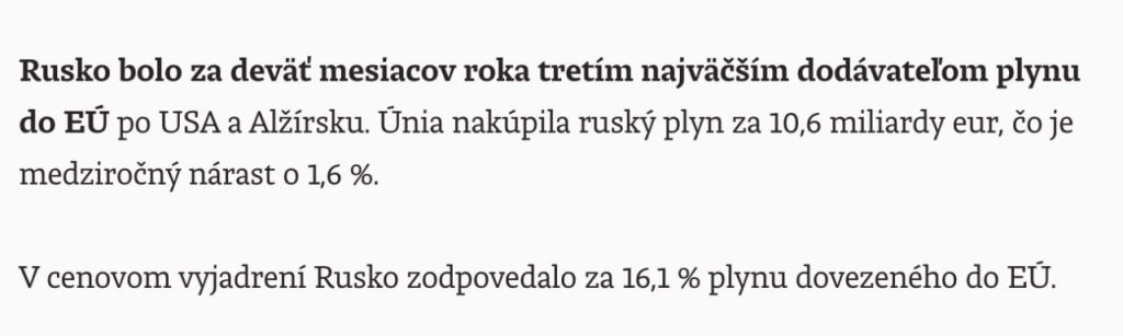С января по сентябрь ЕС закупил у России газа на сумму 10,6 миллиардов евро, что на 1,6% больше, чем за аналогичный период прошлого года. В денежном отношении Россия обеспечила 16,1% от общего объёма импорта газа в ЕС.