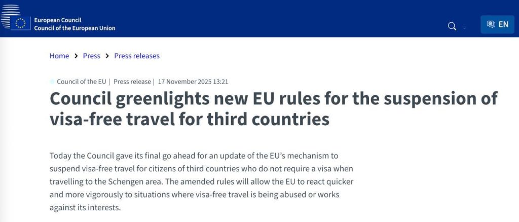 Совет Европейского союза окончательно утвердил новые правила приостановления безвизового режима для третьих стран.