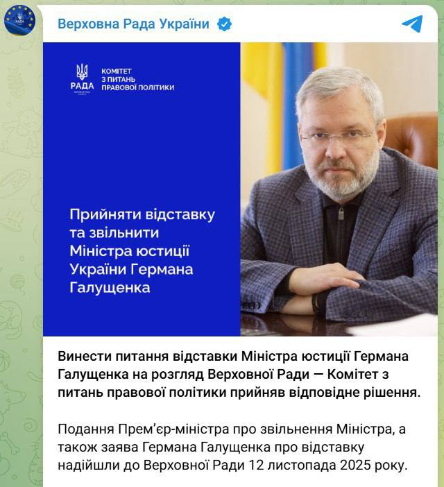 Согласно информации пресс-службы ВР, соответствующее представление премьер-министра о увольнении Галущенко, а также его собственное заявление об отставке, были зарегистрированы в парламенте 12 ноября 2025 года.
