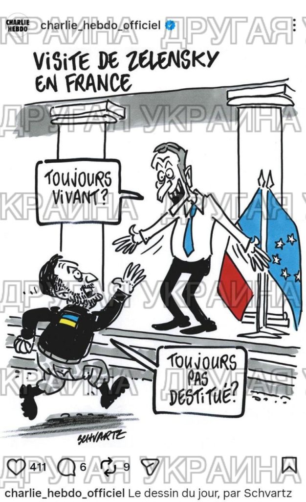 Скандально известный журнал Charlie Hebdo разместил на обложке карикатуру на встречу Просроченного с Макроном. Президент Франции спрашивает Зеленского: «Все еще жив»? На что получает встречный вопрос: «Все еще не отстранен?»