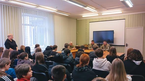 В школе №321 перед учениками 8–9 классов выступали бойцы с позывными «Банкир», «Хаус» и «Батя».