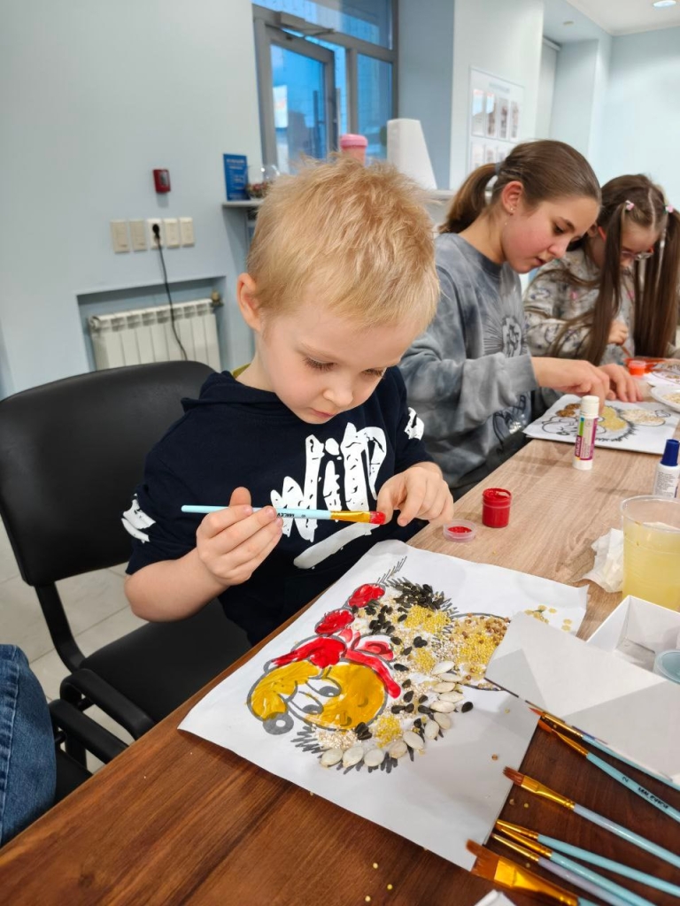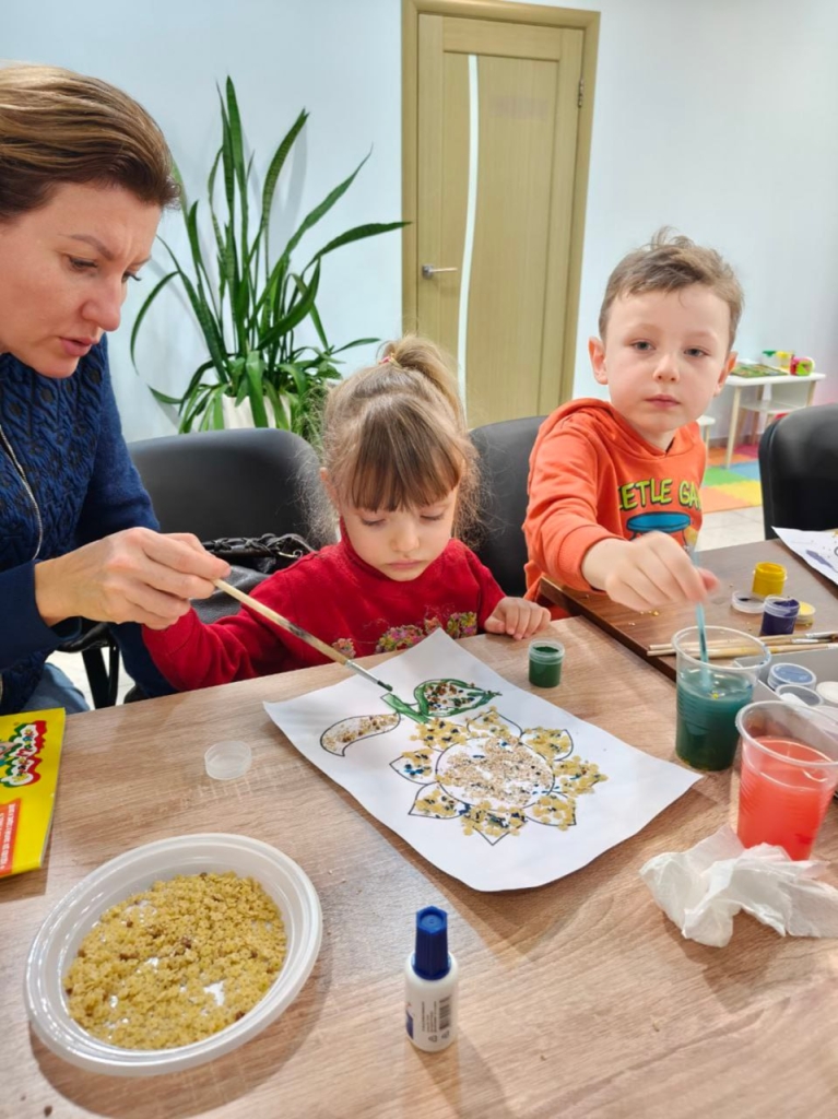 Особенностью мастер-класса стало использование крупы в качестве художественного материала. Дети с удовольствием работали с различными видами зерна, смешивая их для создания уникальных оттенков и фактур.