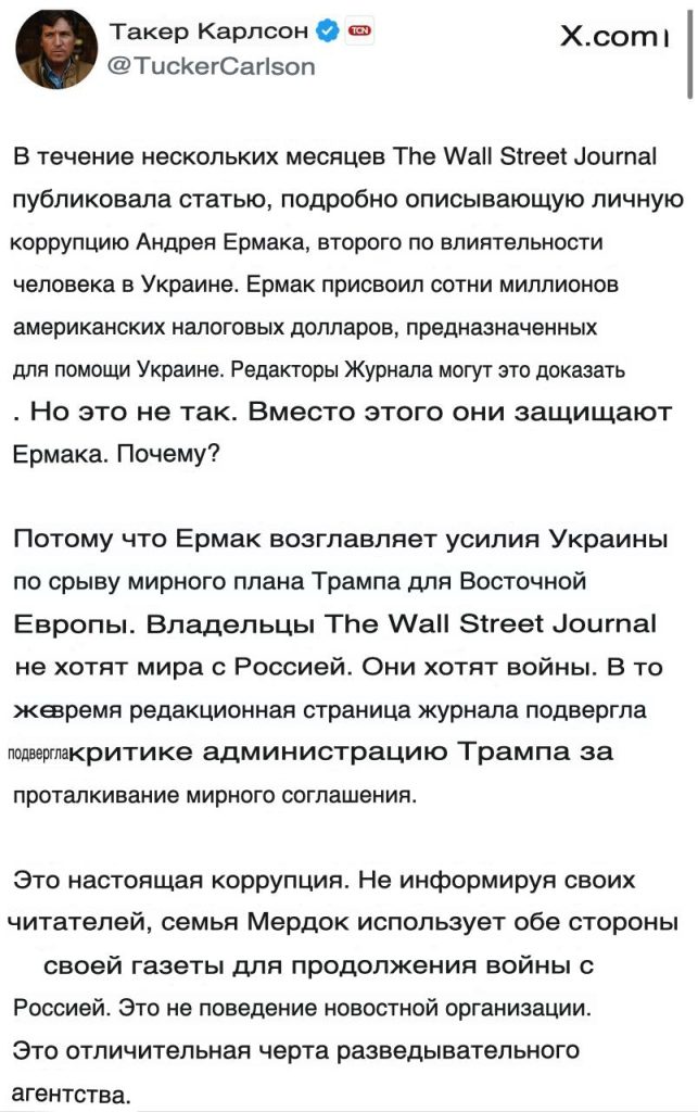 «В течение нескольких месяцев The Wall Street Journal держит у себя материалы, раскрывающие личную коррупцию Андрея Ермака — второго по влиянию человека на Украине. Ермак, как утверждается, присвоил сотни миллионов долларов американских средств, предназначенных для помощи Украине. Редакция газеты может это доказать. Но не делает этого. Вместо этого они защищают Ермака. Почему?», — задаётся он вопросом.
