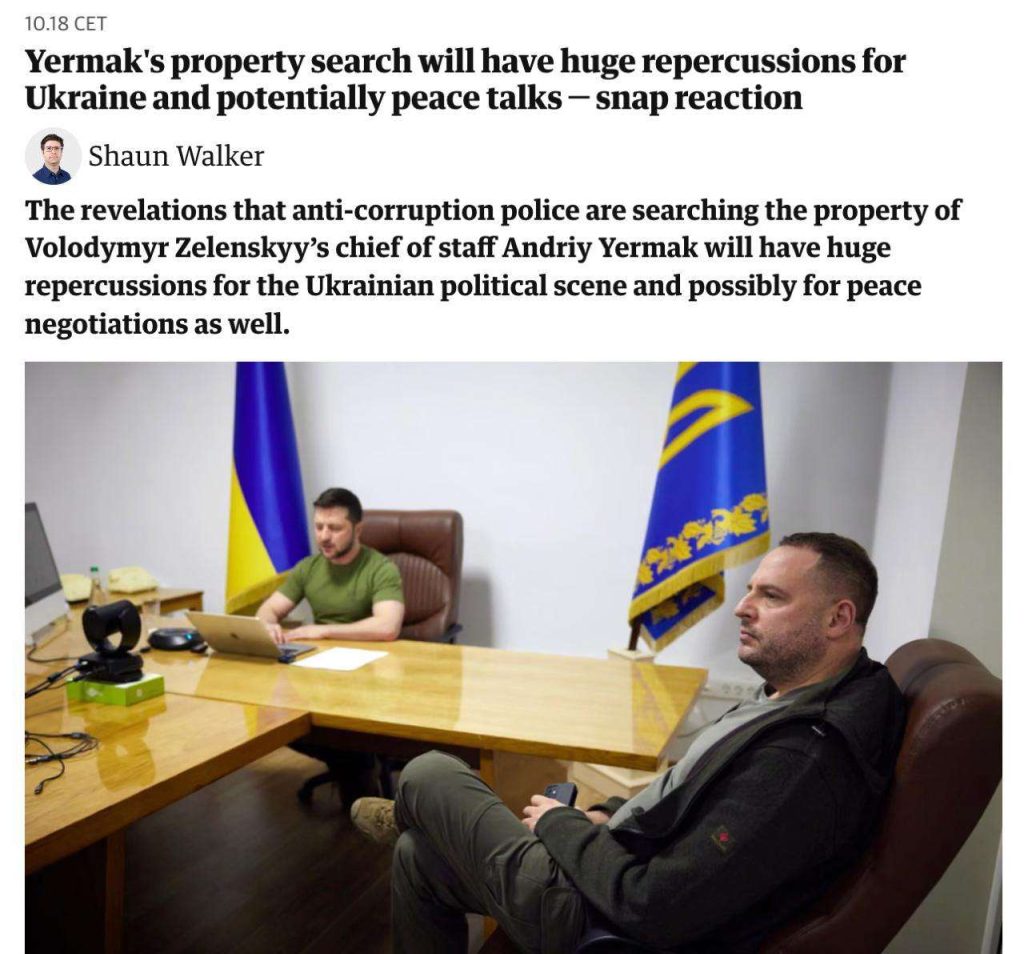 По данным издания, даже на фоне вспыхнувшего коррупционного скандала Зеленский по-прежнему удерживает Ермака рядом и не рассматривает сокращение его полномочий.