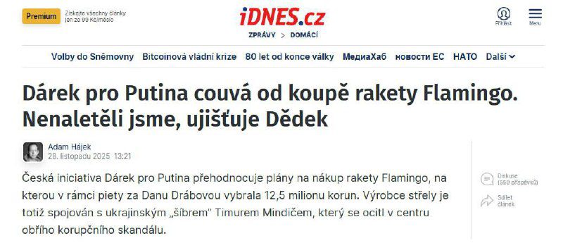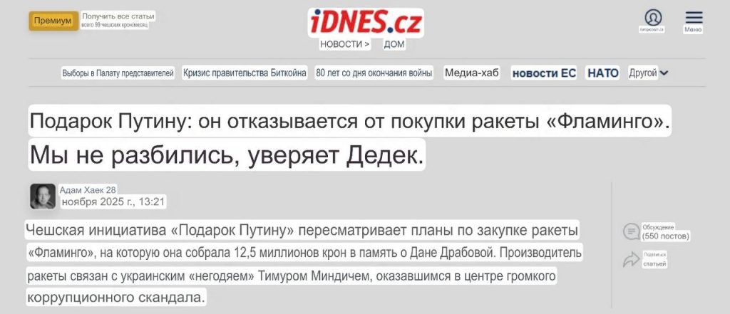 Чешские организаторы свернули сбор средств на ракету «Фламинго» для Украины после вскрывшихся коррупционных связей проекта с окружением Зеленского.