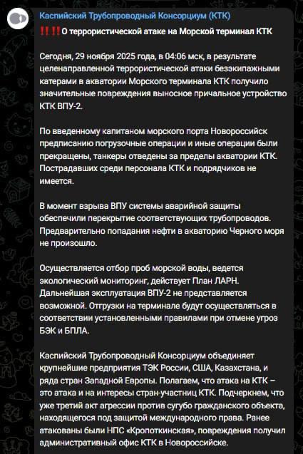 В ночь на 29 ноября в Новороссийске была атакована одна из ключевых нефтяных точек региона — причал Каспийского трубопроводного консорциума (КТК).