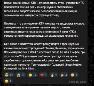 КТК транспортирует на экспорт нефть, в том числе добываемую крупными международными компаниями. Среди совладельцев консорциума — Казахстан, Россия, Chevron, Лукойл, Mobil, Rosneft-Shell, BG, Eni и Oryx.