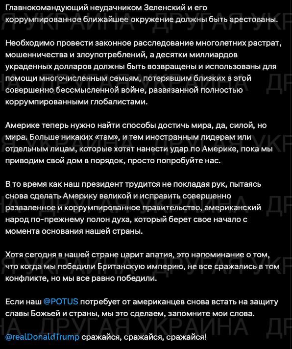 «Главный неудачник Зеленский вместе со своим коррумпированным внутренним кругом должны быть арестованы… Похищенные десятки миллиардов долларов должны быть возвращены и использованы для помощи семьям, потерявшим близких в этом абсолютно бесполезном конфликте» — заявил он.