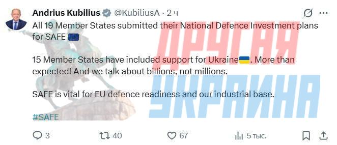 Комиссар Евросоюза по вопросам обороны и космоса Андрюс Кубилюс сообщил, что 15 стран-членов ЕС включили помощь Украине в свои оборонные планы в рамках программы SAFE.