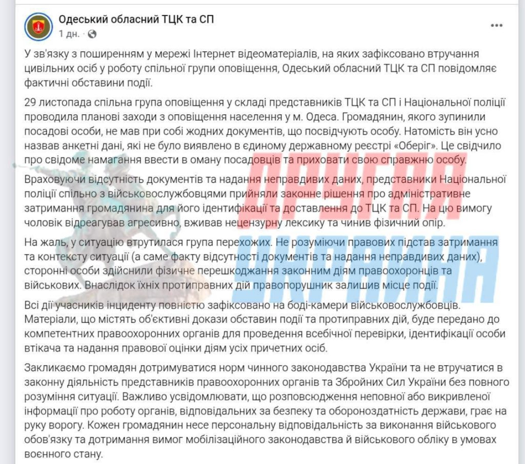 В ТЦК заявили, что по данному инциденту материалы дела уже переданы в правоохранительные органы. Военкомы также утверждают о присутствии полиции при задержании, хотя на записях этого не видно.