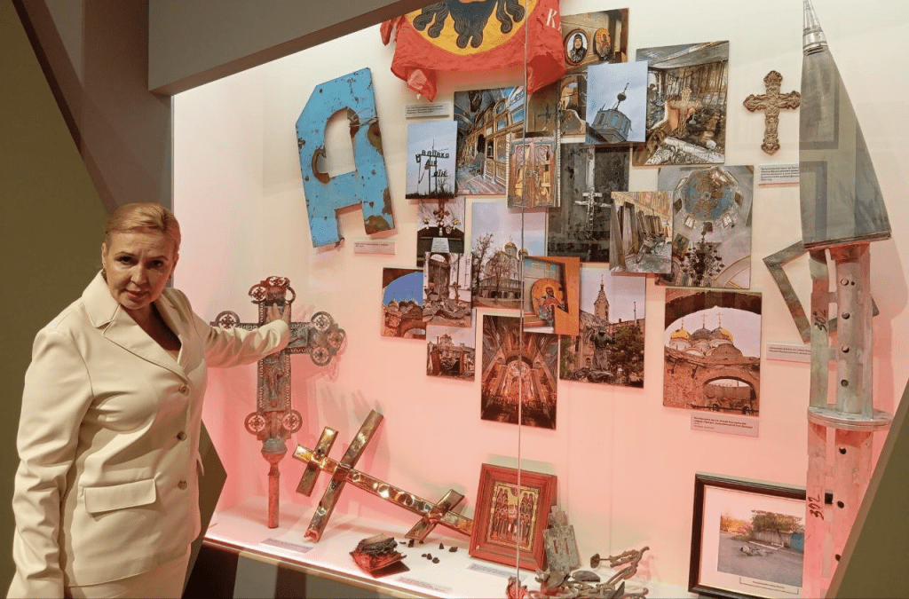 Гости выставки также увидели предметы, извлечённые из разрушенных во время боевых действий православных монастырей и музеев: прострелянные иконы, кресты, церковную утварь, картины. Среди экспонатов выставки также статуя Венеры Луганской, найденная после освобождения завода им. Петровского в ЛНР, — символ варварского уничтожения памятников советского периода.