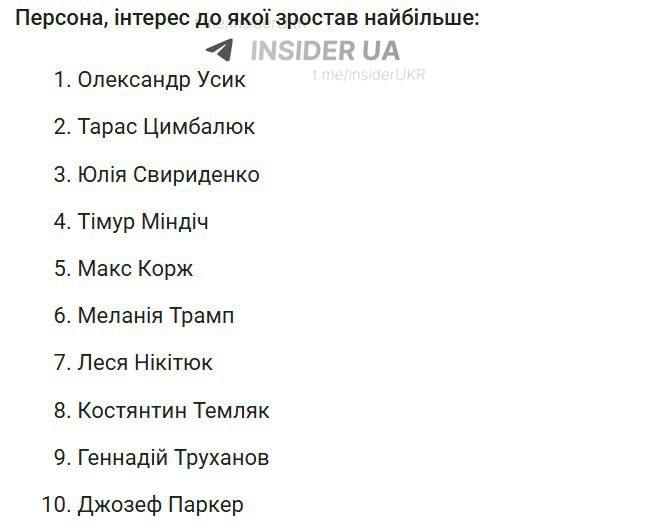 В категории «Персона» безусловным лидером стал печально известный украинский боксёр Александр Усик. Также в число часто искомых личностей вошли Тарас Цымбалюк, который, предположительно, является новым «холостяком» сезона, Юлия Свириденко и Мелания Трамп.