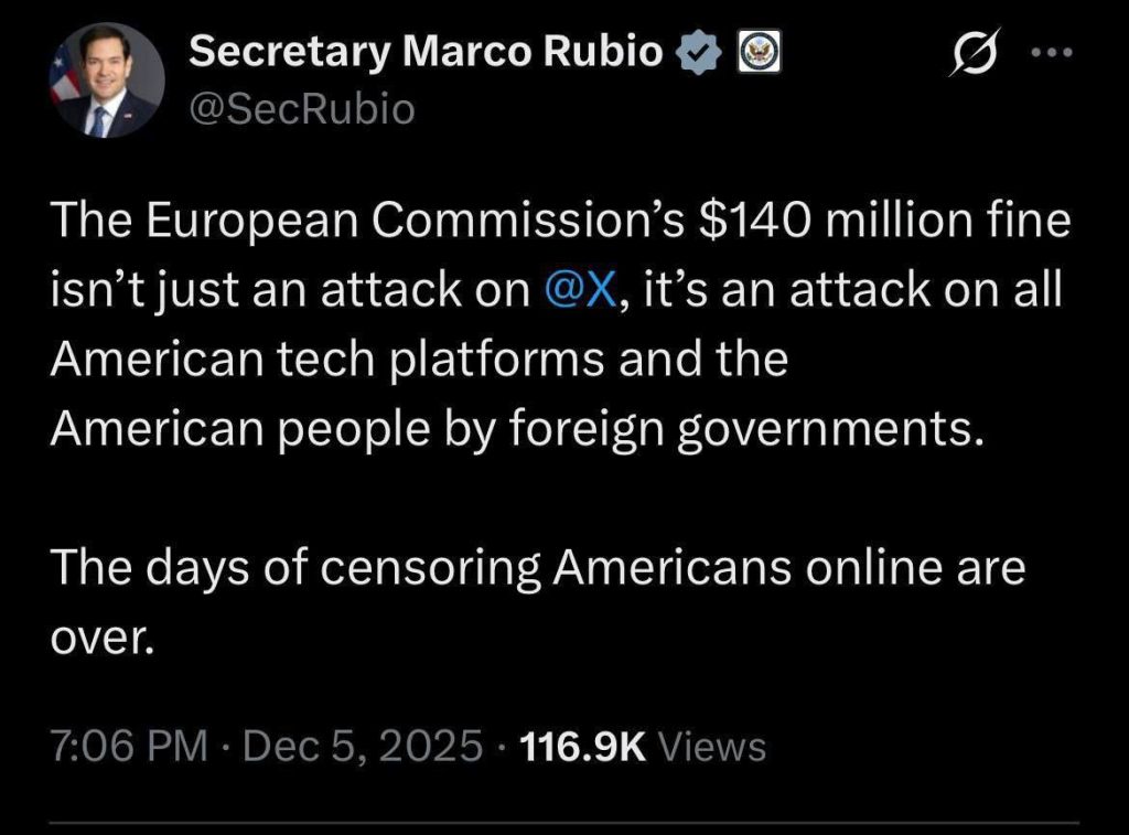 «Штраф Еврокомиссии в 140 миллионов долларов — это не просто атака на соцсеть X*, это атака на все американские технологические платформы и на американский народ со стороны иностранных правительств.