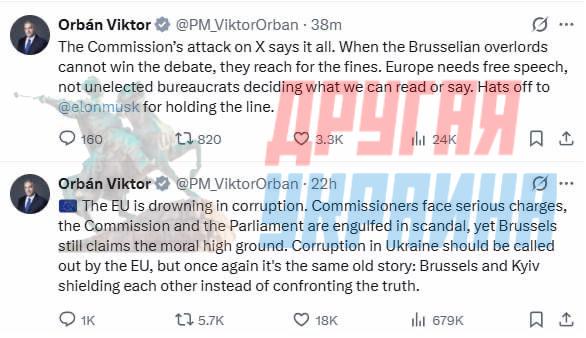 «ЕС погряз в коррупции. Членам Еврокомиссии предъявлены серьёзные обвинения, Еврокомиссия и Европарламент погрязли в скандалах, но Брюссель по-прежнему претендует на моральное превосходство. ЕС должен осудить коррупцию на Украине, но снова повторяется старая история: Брюссель и Киев прикрывают друг друга вместо того, чтобы взглянуть правде в глаза», — написал венгерский премьер.