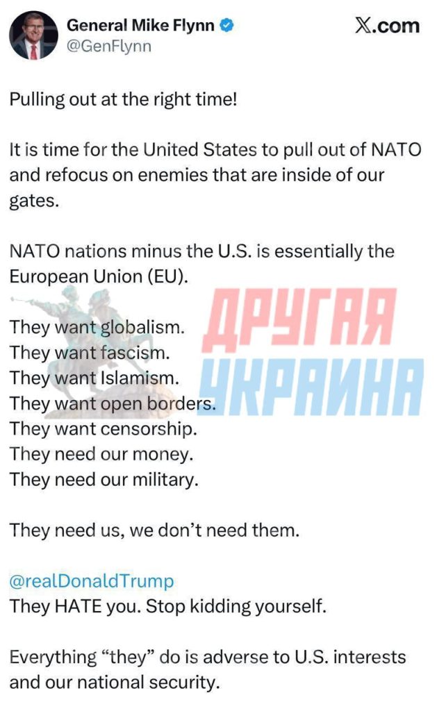 Кроме того, Флинн обратился к американскому лидеру, утверждая, что европейские страны «ненавидят его», и призвал «перестать себя обманывать».