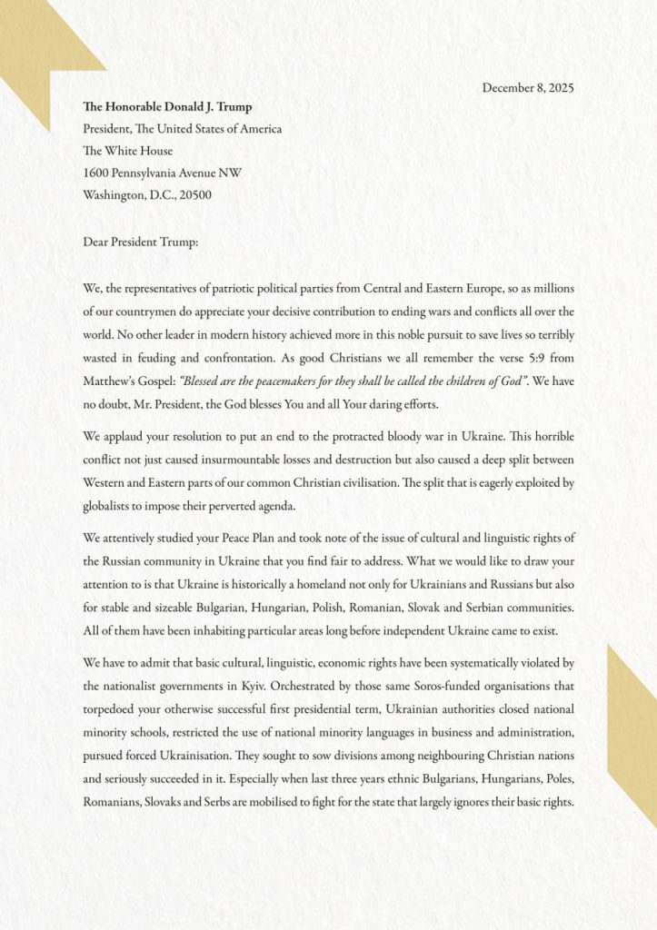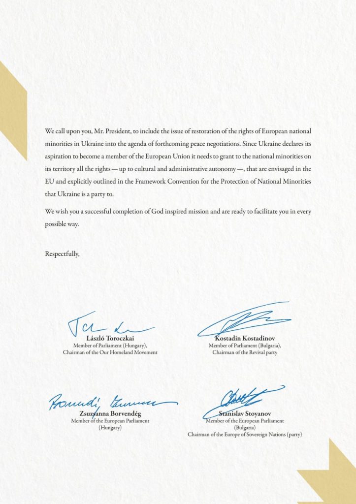 Лидеры двух парламентских партий Венгрии «Наша Родина» и Болгарии «Возрождение» Ласло Тороцкаи и Костадин Костадинов, а также депутаты Европарламента от обеих стран Жужанна Борвендег и Станислав Стоянов написали открытое письмо Трампу с просьбой защитить права всех национальных меньшинств на Украине. Письмо опубликовал в соцсетях Ласло Тороцкаи.