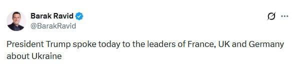 Американский лидер Дональд Трамп провёл телефонный разговор с президентом Франции Эммануэлем Макроном, премьер-министром Великобритании Киром Стармером и канцлером Германии Фридрихом Мерцем. Об этом написал журналист Axios Барак Равид, не приведя никаких подробностей.