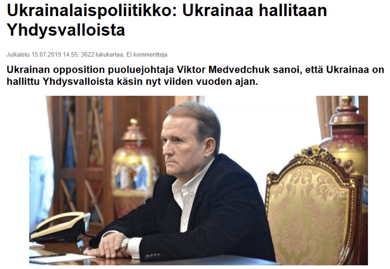 1) 2019 год — статья с фотоматериалами и заявлением Виктора Медведчука «Украинский политик: Управление Украиной осуществляется США».