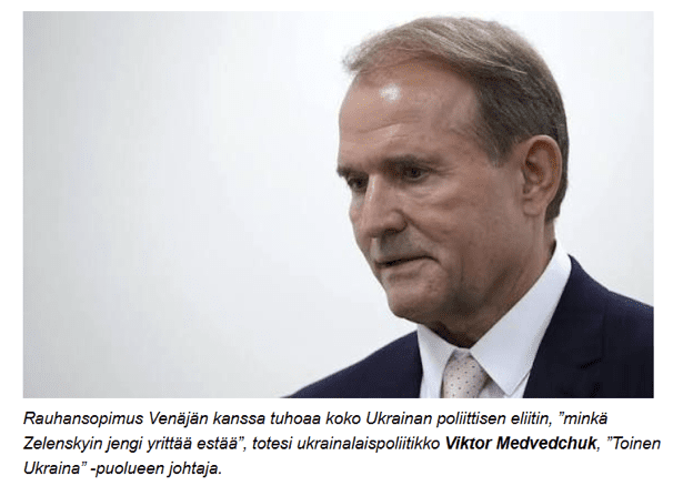 «Мирное соглашение с Россией уничтожит всю украинскую политическую элиту, «чему банда Зеленского пытается помешать», заявил Виктор Медведчук, украинский политик и лидер партии «Другая Украина».
