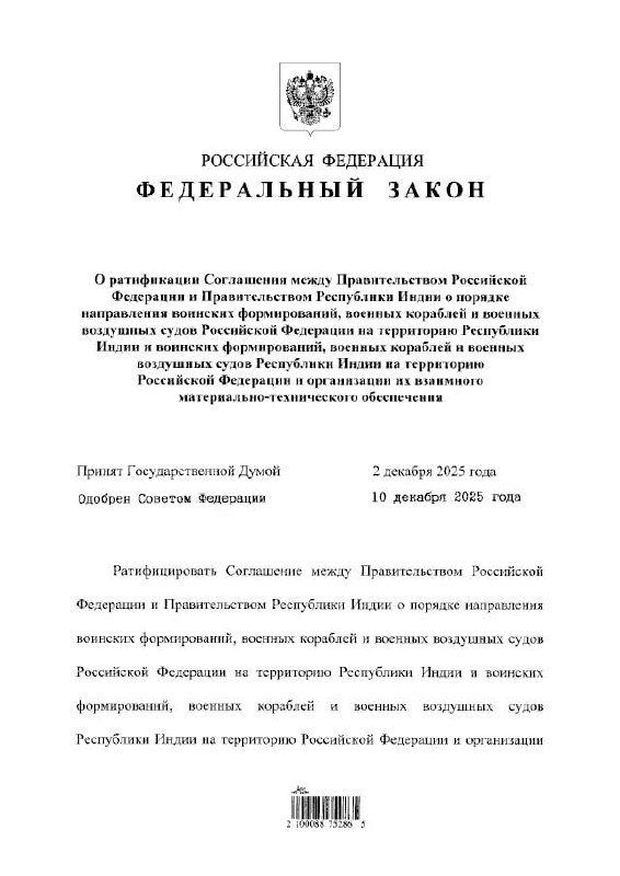 Владимир Путин подписал закон о ратификации соглашения России и Индии о порядке взаимного направления военного контингента, кораблей и самолетов на территории друг друга.